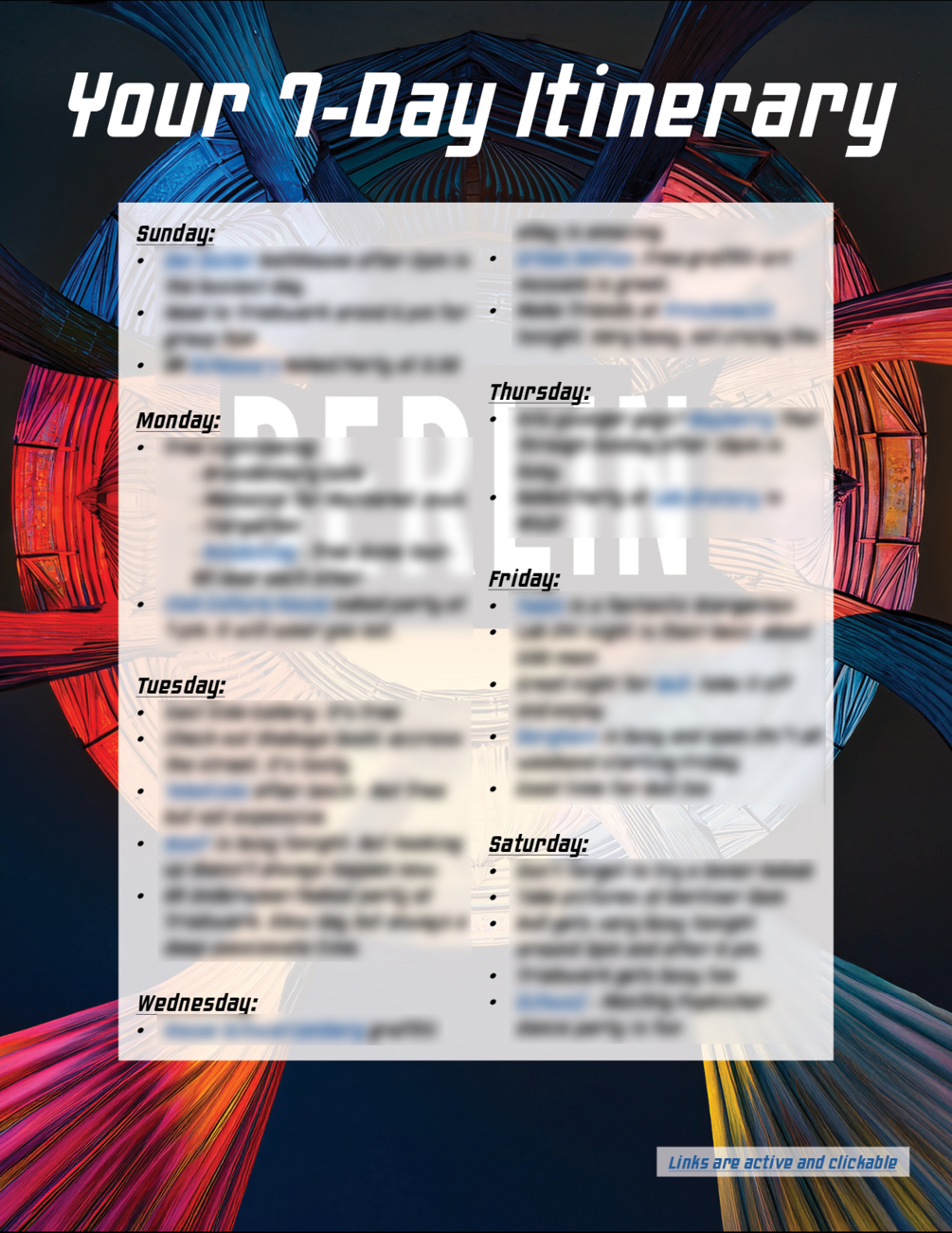This itinerary is NOT to be confused with the gay Berlin travel guide 2025 I sell on Etsy. Although a version of this itinerary already exists inside the Etsy guide. This itinerary makes it quick and easy to navigate with quick descriptions and active links so you can get all the details you need right away.